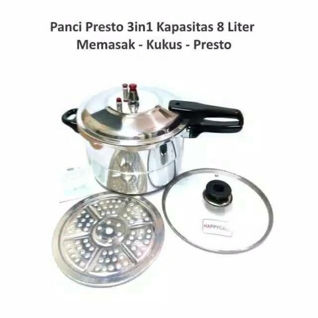 mohon tanyakan stok sebelum membeliPanci presto ini mampu menampung bahan masakan hingga 8 liter. Kapasitas besar ini membuat Anda dapat memasak untuk seluruh keluarga tanpa kesulitan panci presto 3in1 merupakan trobosan terbaru dari panci prestoMemasak makanan dengan menggunakan pressure cooker dapat menghemat waktu memasak Anda karena panci ini menggunakan prinsip tekanan udara yang lebih tinggi sehingga masakan lebih cepat matang.Menjaga NutrisiTerbuat dari bahan aluminium berkualitas yang aman bagi makanan dan awet untuk digunakan dalam jangka panjang. Panci presto ini dapat digunakan sebagai pelunak atau pengempuk daging, ayam dan bahan masakan lainnya.Panci Presto Berfungsi pada saat tekanan uap panas di panci Pressure regulator mengeluarkan bunyi berdesis pada saat sedang beroperasi .sangat cocok memsak untuk melunakkan masakan makananPanci Presto 3in1 : MEREBUS MEMASAK, MENGKUKUS,MEMPRESTOKapasitas : 8 Liter ( 24 cm)Material 100 alumunium (AntiKarat)Memasak Lebih Cepat dan MudahHemat WaktuDouble Handle Mengunci PrestoKatup Pengaman Udara Uap PrestoHandle Tangan Anti Panas Kualitas TerbaikDilengkapi Steamer Tutup KacaDimensi Produk : D 24 x T 20 x P 46 cmDimensi Dus Box : 42.5 x 29 x