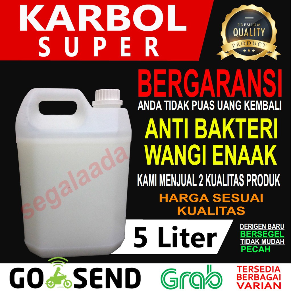 KARBOL CAIR ( CEMARA )Wangi Plus Anti BakteriIsi = 5000 mlKemasan JerigenKarbol ini dengan mudah membersihkan dan menghilangkan bau yang tak sedap pada ruangan, umumnya digunakan pada kamar mandi, menghilangkan bakteri dan kuman penyakit.Cara penggunaan :- Tuangkan kedalam toilet untuk menghilangkan bau tak nyaman- Tuangkan kedalam Ember berisi air untuk membersihkan lantai dan pel seperti biasa Lantai rumah bersih bebas dari kuman dan ba
