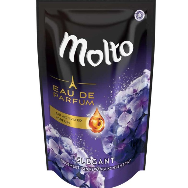Molto Pelembut & Pewangi Eau de Parfum Elegant Refill 720mlPewangi dan pelembut pakaian Molto kemasan refillDengan keharuman parfum elegan yang tahan sepanjang hariMelembutkan hanya dengan 1x bilasanKonsentrat, cukup setengah tutup