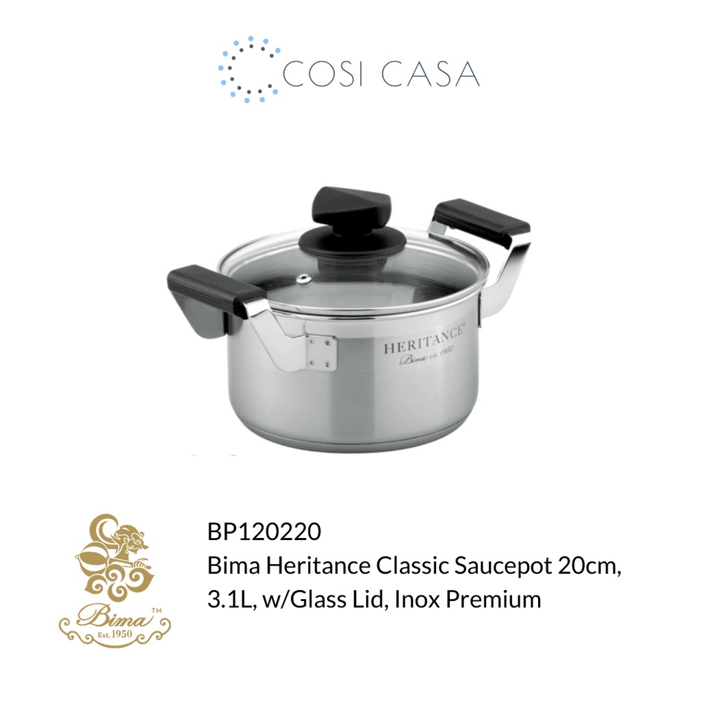 BP120220. Panci Bima HERITANCE CLASSIC Stainless Steel (S/S) Diameter 20 cm, dan Volume 3.1 L. Dilengkapi dengan tutup Tempered Glass. Heritance Classic dengan handles berbahan bakelite yang tetap dingin dan tutup kaca “tempered glass”, pilihan terbaik unutk pemakaian rumah tangga.Dapat digunakan untuk semua sumber panas (Kompor)Heritance Series, salah satu seri cookware Bima, terbuat dari superior stainless steel, dirancang secara khusus unutk setiap dapur komersial maupun rumah tangga. Diciptakan secara istimewa oleh Bima, sebuah perusahaan logam dengan pengalaman lebih dari 70 tahun, Heritance menawarkan harga terbaik untuk nilai tambah produk berkualitas premium, inovatif, dan memiliki daya tahan kuat. Seluruh lini Heritance stainless steel cookware dirancang dengan 3-Ply Encapsulated Base Technology untuk memastikanm emasak lebih mudah, efisien, presisi dan sempurna.Berdiri sejak tahun 1950, Bima dikenal keunggulannya sebagai pionir produsen peralatan dapur berkualitas prima yang bertaraf international. Pada tahun 1970, Bima menjadi pabrik panci Stainless Steel pertama di Indonesia dan terus berinovasi untuk meningkatkan kualitas dan teknologi. Produk Stainless Steel Bima merupakan produk andalan yang banyak diexport ke berbagai belahan dunia seperti USA, Japan, Europe, South Korea, South Africa, dll. Berpengalaman selama lebih dari 69tahun, dan didukung oleh inovasi teknologi modern, Bima adalah sebuah produk kebanggaan Tanah Air yang menjadi warisan bagi generasi penerus.Temukan barang dapur dan ruang makan berkualitas di toko kami, Cosicasa Liv