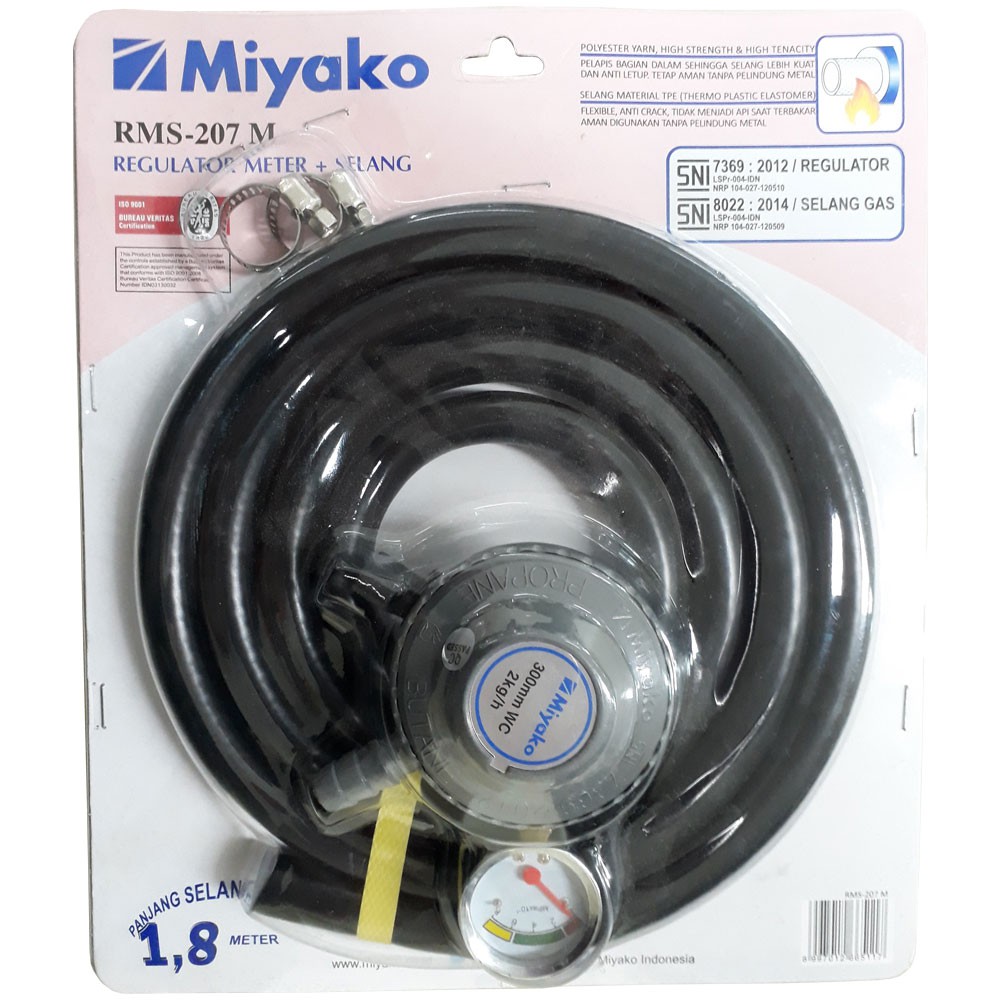 Miyako RMS-207M – Selang + Regulator dilengkapi dengan Polyester Yarn, High Strength, & High Tenacity yang merupakan Pelapis bagian dalam sehingga selang lebih kuat dan anti letup, tetap aman tanpa pelindung metal. Sangat cocok digunakan pada kompor
