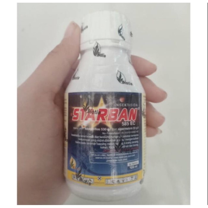 STARBAN 585ecInsektisidaBahan aktif,:klorpiripos 530g/lSipermetrin 55g/lRacun kontak dan lambung berbentuk pekatan berwarna kekuningan yg dapat diemulsikan untuk mengendalikan hama pada tanaman bawang merah. Kacang panjang. Kakao. Kedelai. Mentimun dan t