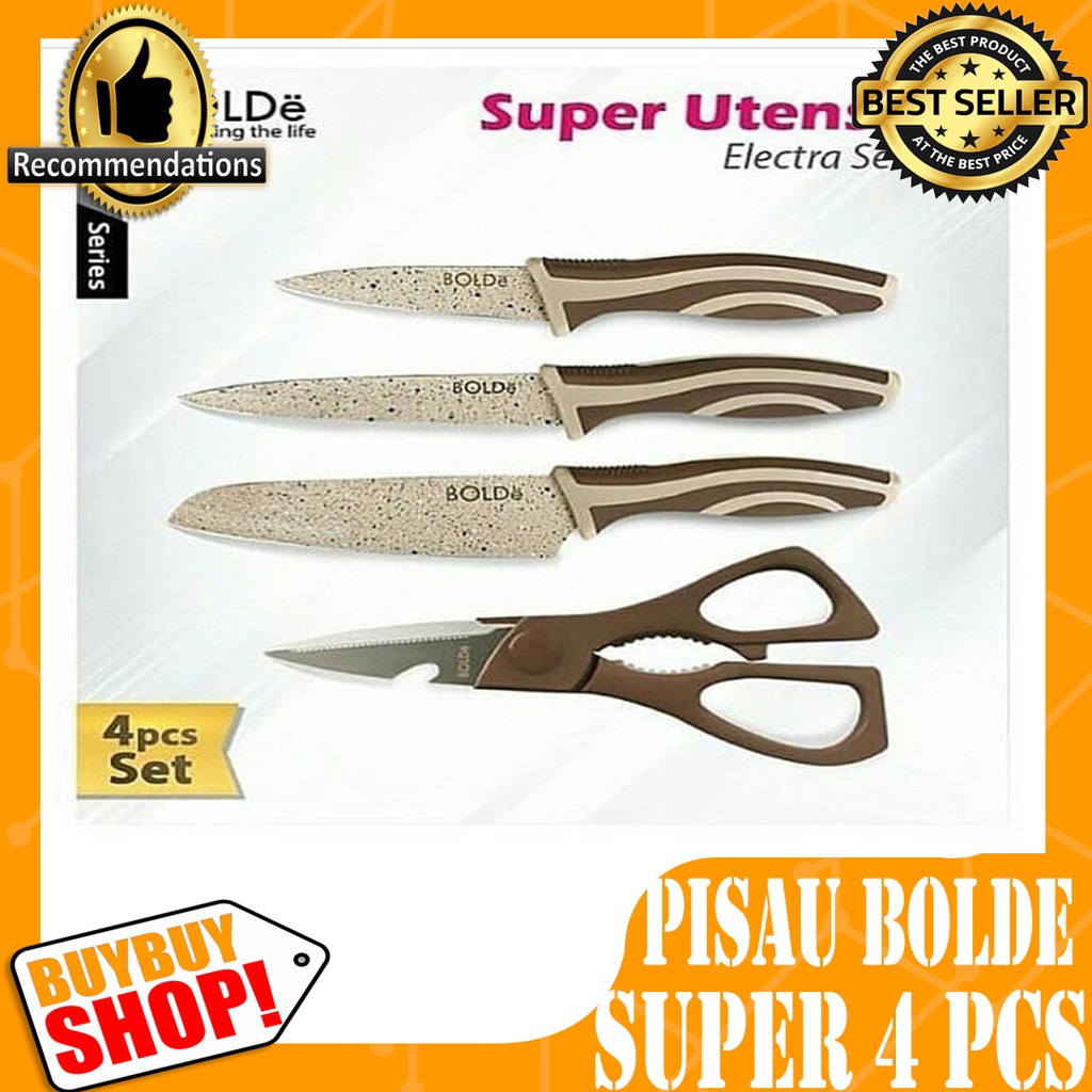 "SELAMAT DATANG DI BUYBUYSHOP"Belanja Mudah Harga HematSilahkan follow toko kami untuk mendapatkan info barang dan harga terupdate* KONFIRMASI KETERSEDIAAN BARANG MELALUI FITUR CHAT / PESANBOLDe kini hadir dengan peralatan memasak BOLDe Super Utensil knife.Gagang dari BOLDe Super Utensil Electra Series Knife menggunakan Nylon Material dengan Premium Quality Grade yang sangat nyaman digunakan untuk aktivitas memasak anda.Fitur :FDA ApprovedFood GradePremium QualityElegant Design with Granite ModelNylon MaterialTerdiri dari :1 pcs Fruit Knife (Pisau buah)1 pcs Cutter Knife1 pcs Meat Cleaver (Pisau Daging)1 pcs Scissor (Gunting Dapur)Segera koleksi perlengkapan dapurmu dengan BOLDe Note :- Mohon cantumkan warna yg di pilih dan berikan alternatif warna lain. Jika tidak ada keterangan dan altenatif warna maka kami akan kirim warna random tanpa konfirmasi.GK SETUJU DIKIRIM RANDOM , TULIS GK ADA WARNA = CANCEL- BARANG NO GARANSI , NO COMPLAIN , NO RETUR , NO CANCEL- Sebelum dikirim brg di cek OK. Tidak terima komplain brg rusak/pecah belah dll sebaiknya tambahkan PACKING EKSTRA AMAN dalam daftar belanja