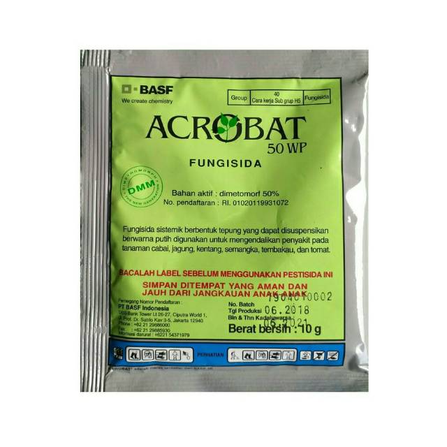 Fungisida Acrobat 50 WP merupakan pestisida kategori fungisida berjenis fungisida sistemik. Acrobat 50 WP produk dari PT. BASF Indonesia. Fungisida Acrobat 50 WP berbentuk tepung berwarna putih dan dapat disuspensikan. Fungisida Acrobat 50 WP mengandung bahan aktif dimetomorf 50%. Fungisida Acrobat 50 WP berfungsi untuk mengendalikan penyakit pada tanaman yang disebabkan oleh jamur, seperti penyakit busuk daun, lanas, bercak daun, embun bulu dan bulai. Berikut ini jenis tanaman, penyakit dan dosis pemakaian Acrobat 50 WP :tanaman tomat, penyakit busuk daun, dosis pemakaian Acrobat 50 WP : 0,5-1 g/l.tanaman cabai, penyakit bercak daun,dosis pemakaian Acrobat 50 WP : 2-4 g/l.tanaman kentang, penyakit busuk daun, dosis pemakaian Acrobat 50 WP : 0,5-0,625 g/l.tanaman tembakau, penyakit lanas, dosis pemakaian Acrobat 50 WP : 1-1,25 g/l.tanaman semangka, penyakit embun bulu, dosis pemakaian Acrobat 50 WP : 0,25-0,5 g/l.tanaman jagung, penyakit bulai, sebagai perlakuan benih dosis pemakaian Acrobat 50 WP : 1,25-2,5 g/kg benih.Cara dan waktu aplikasi :Dilakukan penyemprotan volume tinggi pada umur tanaman 21-70 HST. Penyemprotan dengan volume tinggi dilakukan apabila ditemukan gejala serangan dan kelembaban >90%. Untuk jadwal penyemprotan pada interval 7-14 hari tergantung parah tidaknya serangan penyakitnya. Untuk tanaman jagung, pemberlakuanya pada benihnya. caranya setelah benih dibasahi air, campurkan secara me