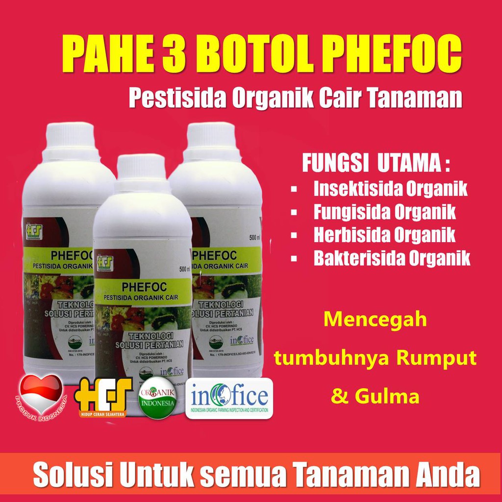 HARGA HEMAT 3 PHEFOC PESTISIDA ORGANIK UNTUK SEGALA TANAMANHarga special bulan tanam untuk Pestisida organik dengan paket 3 botol hanya bayar Rp. 135.000 ( hanya Rp. 45.000/botol ) selama persediaan masih ada. INGAT...!!! SELAMA PERSEDIAAN MASIH ADA LHO. PHEFOC ( Pestisida, Herbisida, Fungisida Organik Cair ) HCS Tanaman selain membutuhkan suplemen untuk berkembang dan bertumbuh subur, juga membutuhkan Pestisida, Herbisida, Fungisida untuk mempertahankan kelangsungan hidupnya.PT. HCS sudah mengantisipasi kebutuhan itu dengan menciptakan produk untuk melindungi tanaman dari serangan hama yang merugikan. Nama produknya adalah PHEFOC.PHEFOC adalah singkatan dari Pestisida, Herbisida, Fungisida Organik Cair, yaitu gabungan fungsi dalam satu produk dari PT. Hidup Cerah Sejahtera.PHEFOC merupakan pembasmi organik terbaik terhadap hama tanaman, gulma, bakteri tanah dan jamur. Selain untuk memaksimalkan hasil dari budidaya tanaman, juga untuk menghemat biaya selama penanaman, perawatan hingga masa panen.Manfaat Penggunaan PHEFOC HCS :- Membasmi hama tanaman seperti wereng, serangga, ulat, dll.- Memulihkan tanaman dari serangan bakteri tanah (sundep).- Membasmi jamur pada tanaman, buah, daun, dan batang.- Membasmi gulma.- Mempercepat pertumbuhan.- Memaksimalkan proses pembuahan.Cara Penggunaan PHEFOC HCS :JENIS TANAMAN TAKARAN1. Padi 8 tutup botol dengan 14 liter air2. Buah 8 tutup botol dengan 14 liter air3. Sayur 6 tutup botol dengan 14 liter air4. Tembakau 6 tutup botol dengan 14 liter airCatatan:PHEFOC HCS Pestisida akan tepat bila digunakan pada tanaman, setelah selesai masa pemupukan.PHEFOC HCS bisa dicampur dengan pupuk organik pada saat penyemprotan.#pestisidaalami#pestisidaphefoc#herbisidaphefoc#pestisidaorganik#pupuk#pestisidanabati #caramembuatpestisidaalami#herbisidaroundup#herbisidasistemik#pupuknpk#mikroorganisme#basmihama#pupukpadi#basmirumput#fungisidaalami#fungisidauntukpadibunting#bakterikultur#pupuknpk#obatfungisida#fungisidasistemik#jamur#basmi