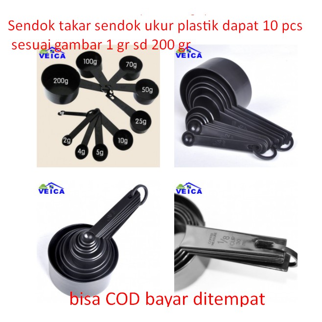 Sendok takar sendok ukur plastik dapat 10 pcs sesuai gambar 1 gr sd 200 grSendok takar ini sangat berguna saat anda sedang meresep masakan atapun sedang masak di dapur agar hasil yang di dapat pas dan takarannya pas anda akan mendapatkan 10 buah sendok ukur dengan ukuran yang berbeda bedaada d Shape ring sehingga sendok takar atau sendok ukur tidak berantakan200g100g70g50g25g10g5g4g