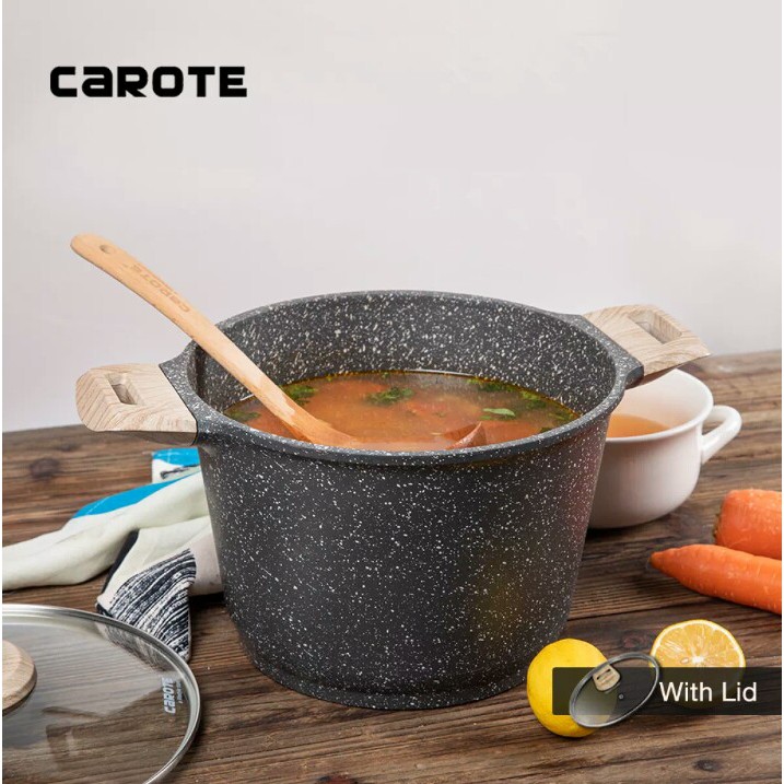 Merk : Carote - Original 100%Tipe : CasseroleUkuran : 22cm dan 24 CM diameter atas (ukuran yang pas untuk memasak makanan berkuah)dengan kedalaman 17cm, diameter bawah 19.1cm, kapasitas 5.8L cukup untuk 4-8orang* FREE TUTUP - PFOA FREE (aman dari bahan berbahaya penyebab kanker)- 5 Layer Import Granite coating - Tahan Gores & lebih awet dari teflon biasa- Lapisan Anti lengket Swiss kualitas Eropa- Sertifikasi internasional ( FDA & SGS Approved)- Model instagramable & cantik- Bisa digunakan di kompor gas, listrik,induksi,keramik&hologen- Induction bottom dengan ketebalan 4.5mm memberikan distribusi panas yang stabil & merata selama proses memasak - Cukup memasak dengan api kecil / pun sedang- Bebas Asap, Dapat memasak dengan sedikit / pun tanpa minyak & lebih sehat- Mudah digunakan dan dibers