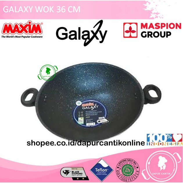Deskripsi GALAXY WOK 36 CM MAXIM / WAJAN / MASPION-Galaxy Wok 36 CM-Packing : No Box-Interior : Black Diamond-Handle : Ergonomic Pheonolic( stay cool while cooking on stovetop )-Even Heat Distribution-Easy to Clean, Cook with les